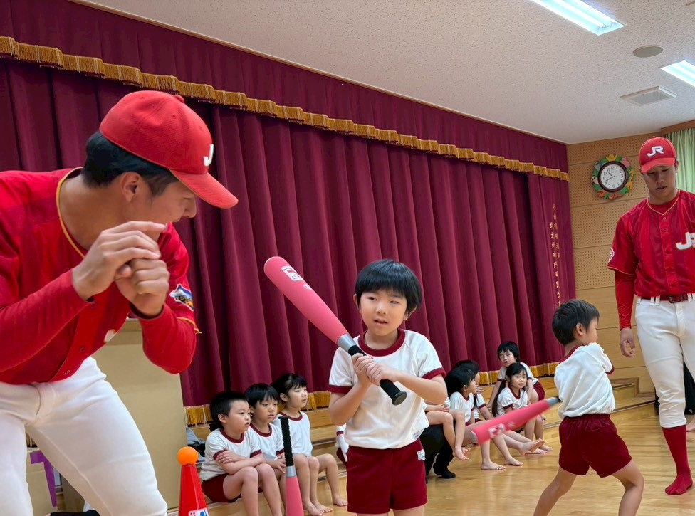 2025年11月28日 JR九州硬式野球部 ティーボール教室開催 JR九州硬式野球部は毎年「ティーボール教室」を実施しております。今回は北九州市門司区にある藤松保育園、こばと幼稚園を訪問しました。当日は、野球部員26名が参加し、園児約80名と一緒にティーボールを楽しみました。