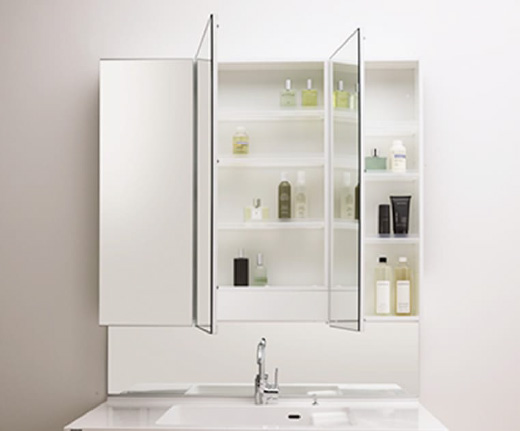 身だしなみを整えやすい三面鏡を採用。センターミラーに曇りにくい特殊加工が施されています。