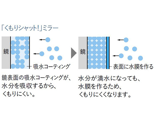 ミラーの表面全体に吸水性のある樹脂膜をコーティングすることで、くもりをおさえます。
