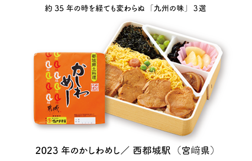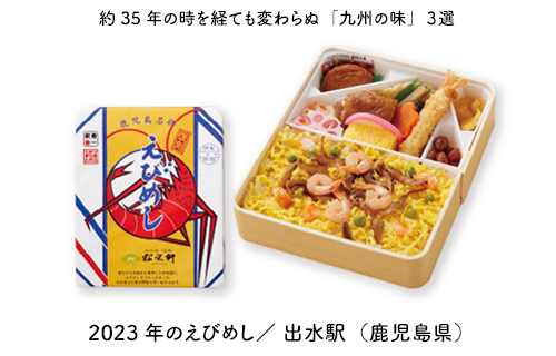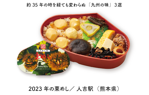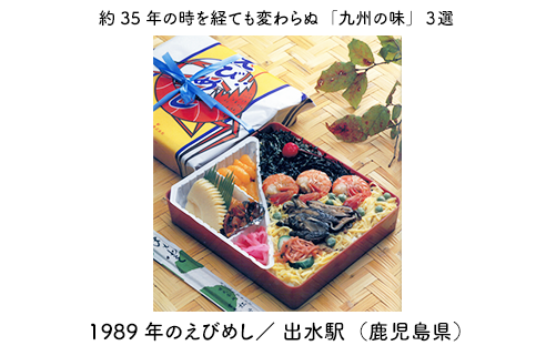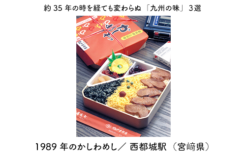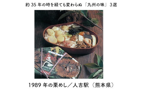 その中には34年たった今も愛され、今回の駅弁グランプリにエントリーしている人吉駅の「栗めし」、出水駅の「えびめし」、西都城駅の「かしわめし」などレジェンド駅弁の姿もあり、変わらないパッケージも伝統の味わいも旅情をかき立ててくれます。