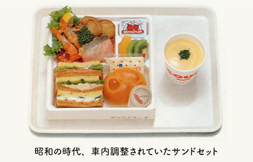 昭和の時代は、急行や特急に食堂車が連結され、厨房で一から調理した夕食向けの焼肉弁当や朝食のサンドウィッチを席を巡回しながら販売していました。