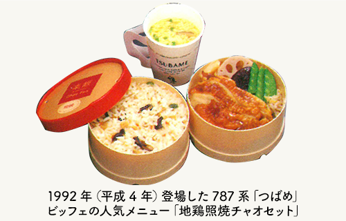 平成の時代は、新型特急787系「つばめ」デビューに合わせ、それまで途絶えていた車内供食設備ビュッフェが復活。電子レンジで調理して提供する専用メニュー「地鶏照焼チャオセット」は、大変好評を博しました。