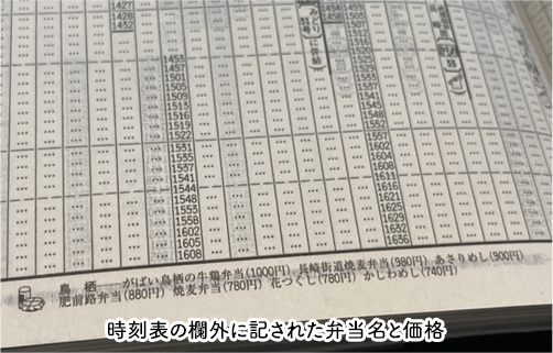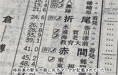 食べ物を購入する店がほとんどなかった時代。列車で移動する人々にとって、乗ったまま購入できる弁当の立ち売りは、なくてはならないもの。以前の時刻表には、弁当が販売される駅や弁当名と価格も記載されていました。