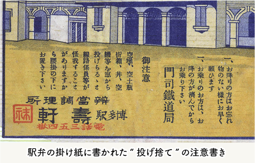 当時の門司駅は、連絡船で本州へ行く人と列車に乗り継ぐ人で大賑わい。乗り継ぎの待ち時間にその人々にお茶のサービス始めた茶店が、やがて九州初の駅弁屋となった「石蔵屋」です。