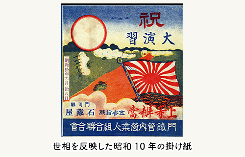 古くはその地方の景勝地や勇壮に走る列車を描いたもの。当時の時代背景を色濃く記録したもの。行事を記念したものなど、掛け紙は、名所案内や広告・広報としての役割も果たしていたのです。