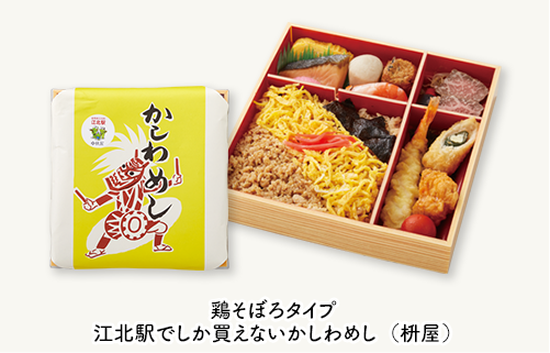 今回の駅弁グランプリには、鳥栖で大正2年に考案された鳥栖駅の「かしわめし」、今でも立ち売りがある折尾駅発祥「大名道中駕籠かしわ」、日本料理の老舗が作る江北駅の「かしわめし」、昭和の発売当時から変わらない西都城駅の「都城郷土料理かしわめし」など各地の名物「かしわめし」がエントリーしています。メインの鶏肉は、刻んだもの、そぼろ、切り身など、それぞれ違った味わいが楽しめます。