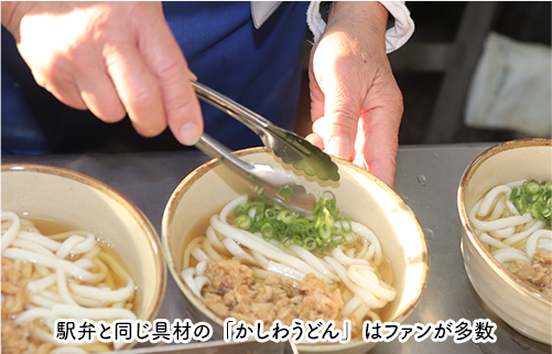 看板メニューの「かしわうどん」は、柔らかな麺にカツオだしの旨味、駅弁のかしわを使った甘辛いかしわが絶品!