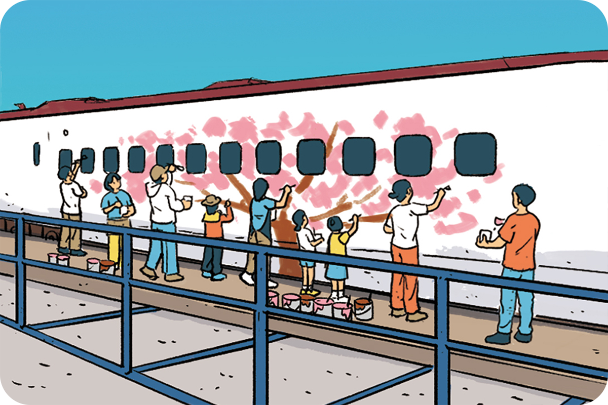 車体いっぱいに咲き広がる桜を描きながら、