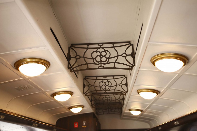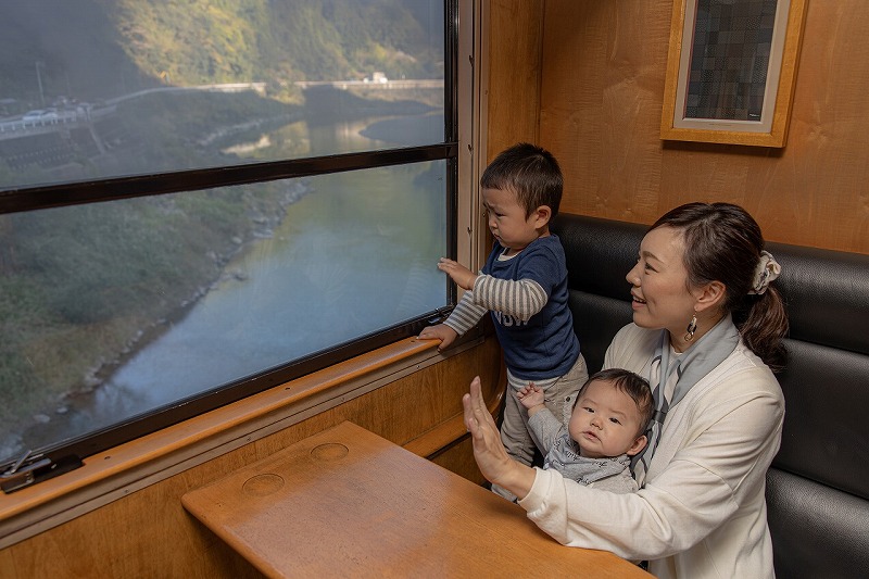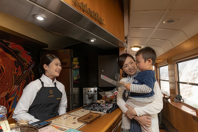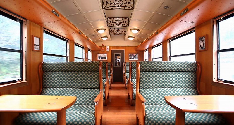 木の香薫るクラシカルな車内に布地と本革が醸し出すボックスシートのハーモニー。ライブラリーやミュージアムコーナーも楽しめます。