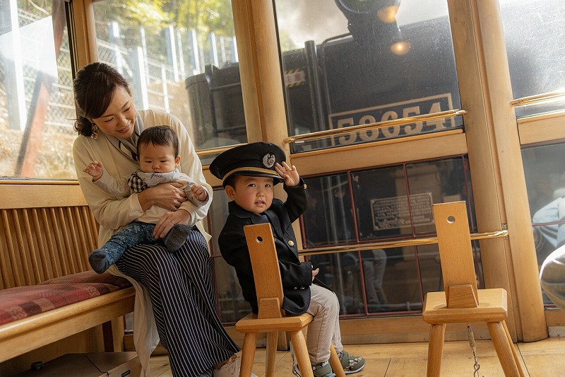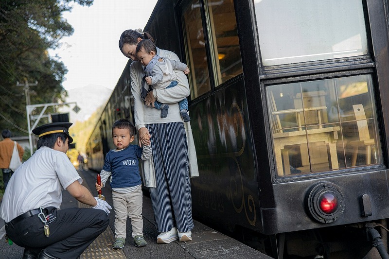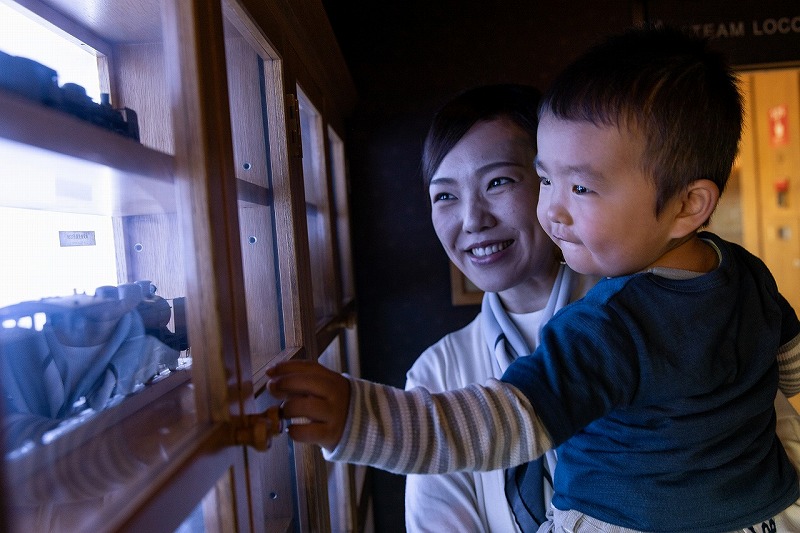 SL人吉はお客さまの大切な思い出づくりを様々なかたちでエスコート。お子さまの記念撮影用に制服をお貸ししたり、駅に停車中の時は機関士の話を聞くこともできます。