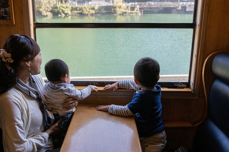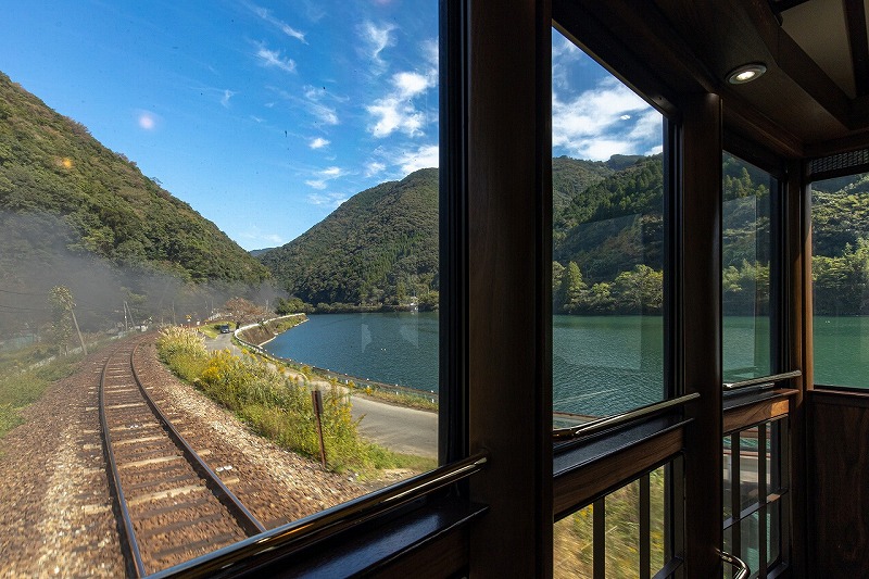 八代ー人吉間は球磨川を車窓から眺めることができます。天候がよいとエメラルドグリーンに輝く水面に出会えます。