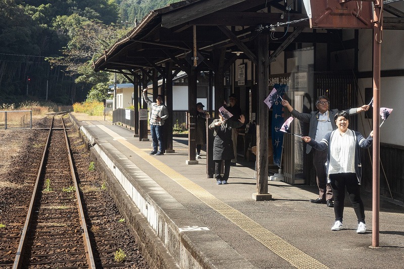 SL人吉の停車に合わせ、球磨焼酎やゆずようかん、梨の万能たれ、棚田米などの特産品をホームで販売。