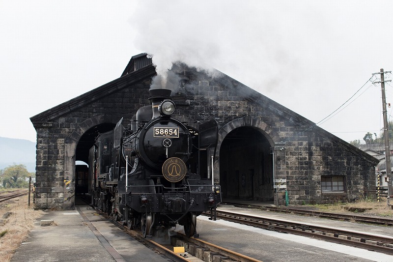 明治44年(1911年)の建築で、今も現役の石造機関庫としては国内唯一。地元の石工たちが球磨地方の石材を生かして作り上げた、重厚な佇まい。入り口の3連アーチがシンボル。
