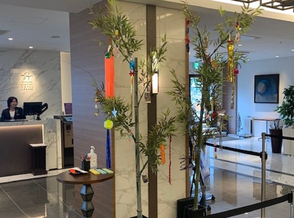 JR九州ステーションホテル小倉では7階フロント前に笹と短冊を設置し、ご宿泊のお客さまはもとより、小倉駅ビル内を回遊される多くのお客さまが短冊に願い事を書いて飾られていました。 -