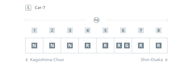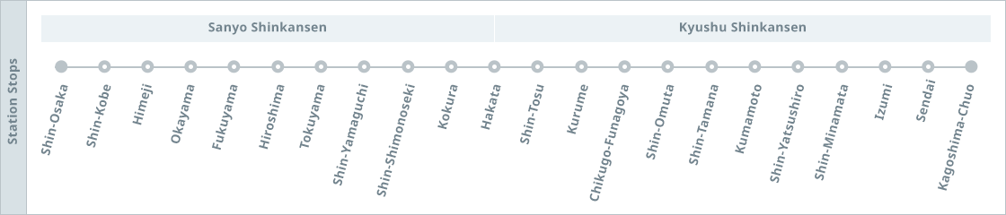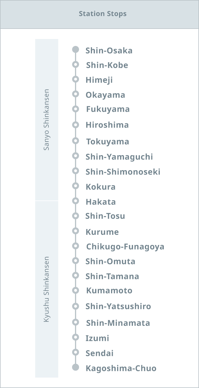 N700-series train runs from Kyushu through the Setouchi region. The exterior is a celadon-like glowing blue-white color. The wood and a deep-toned fabric interior provides a simple yet classy atmosphere.