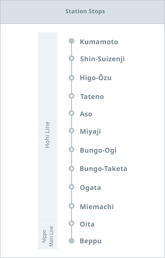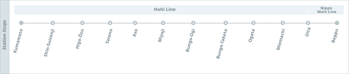 This train takes you from Beppu, one of the largest hot springs resort areas, to Aso, where you will see one of the largest calderas in the world. You can enjoy the major sightseeing spots located in central Kyushu, as well as many beautiful scenic views.