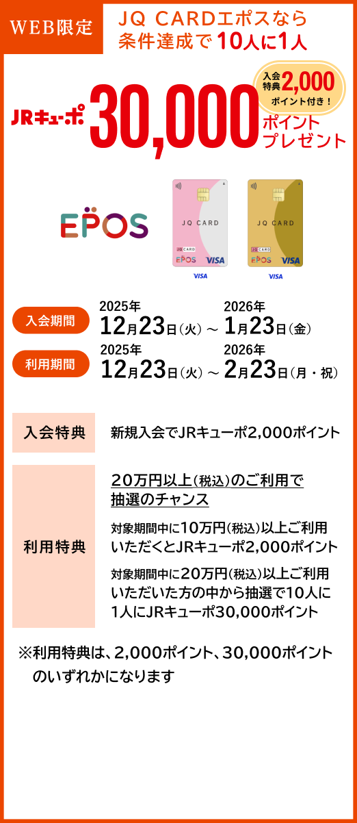 ご入会から2026年2月23日(月・祝)までに100,000円ご利用でJRキューポ8,000ポイントをプレゼント!