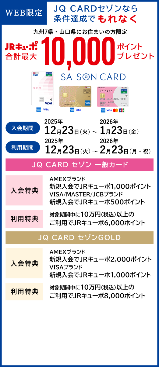 WEB⼊会限定 AMEXブランド新規申し込みでJRキューポ1,000ポイント WEB入会限定 VISAブランド新規申し込みでJRキューポ500ポイント ※2026年3月1日付与 |