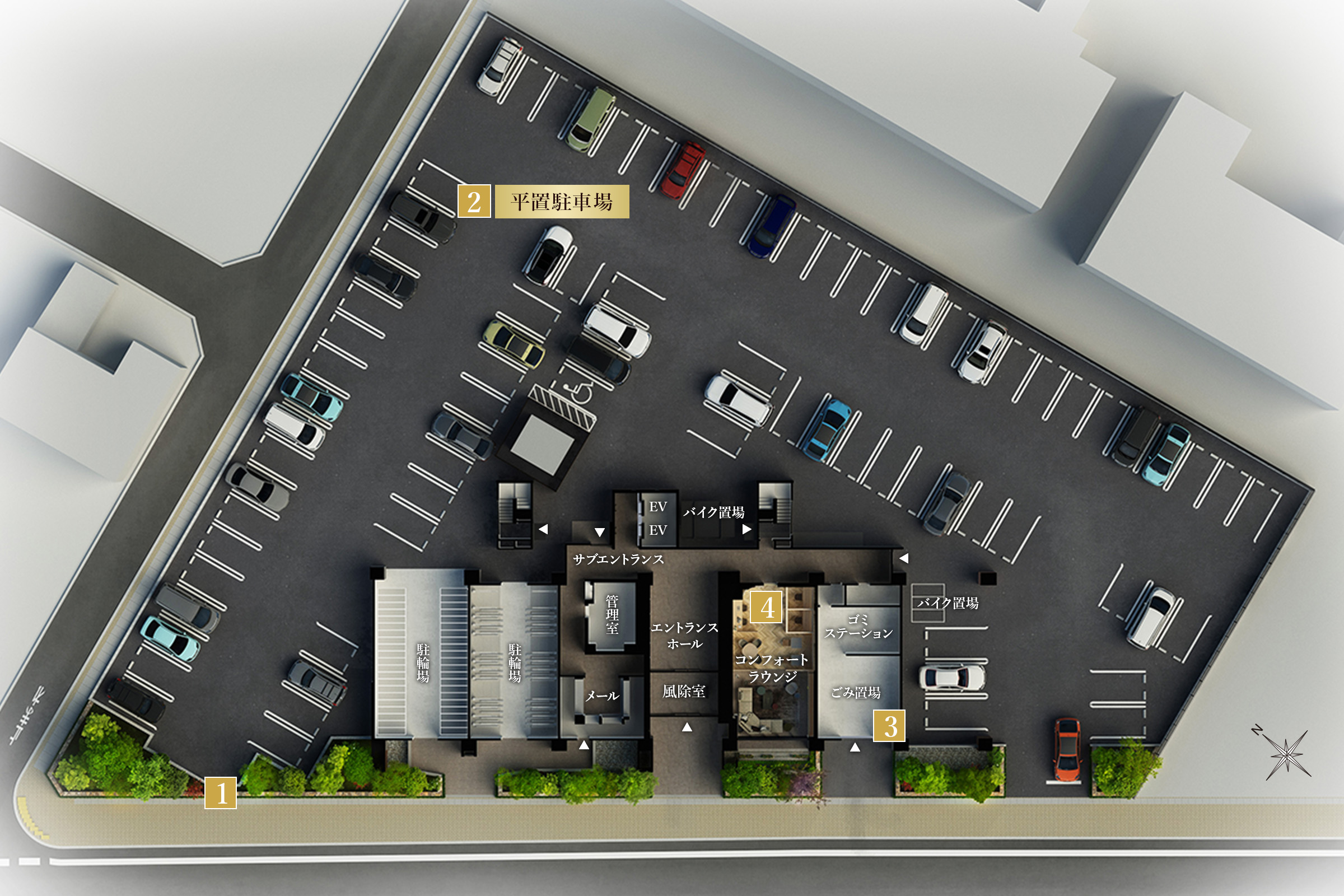 緑道にある新たなランドマークに相応しい、豊かな植栽プラン。ここを行き交う方々の感性を刺激する植栽を配し、細部に至るまで、洗練された空間美を創出。街並みの景観を一層引き立てる四季折々の風格ある木々は、時の経過にとともに豊かに育っていく杜へと成長を遂げることでしょう。