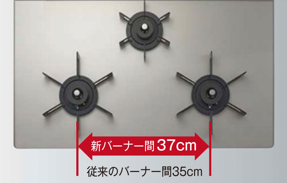 ※Dタイプは幅600㎜となります。バーナー間の寸法が広く同時調理が快適。見た目もスッキリとした印象に。