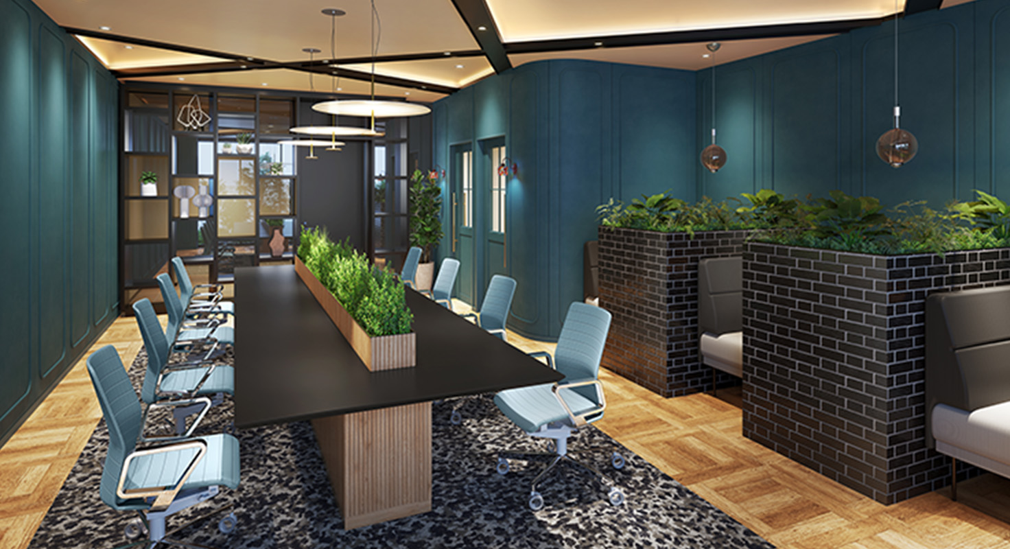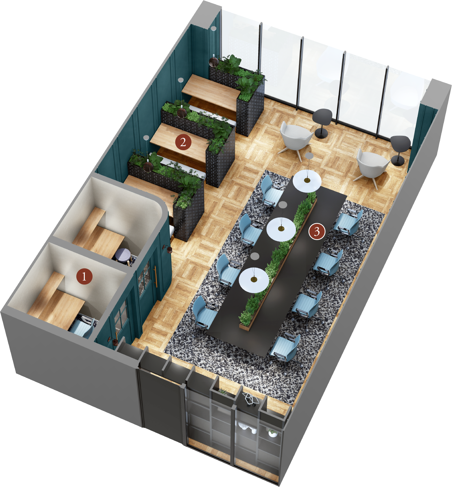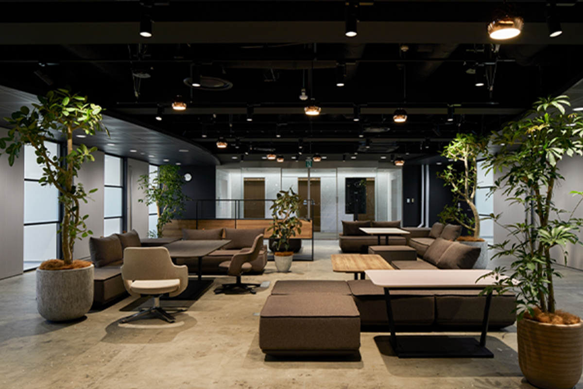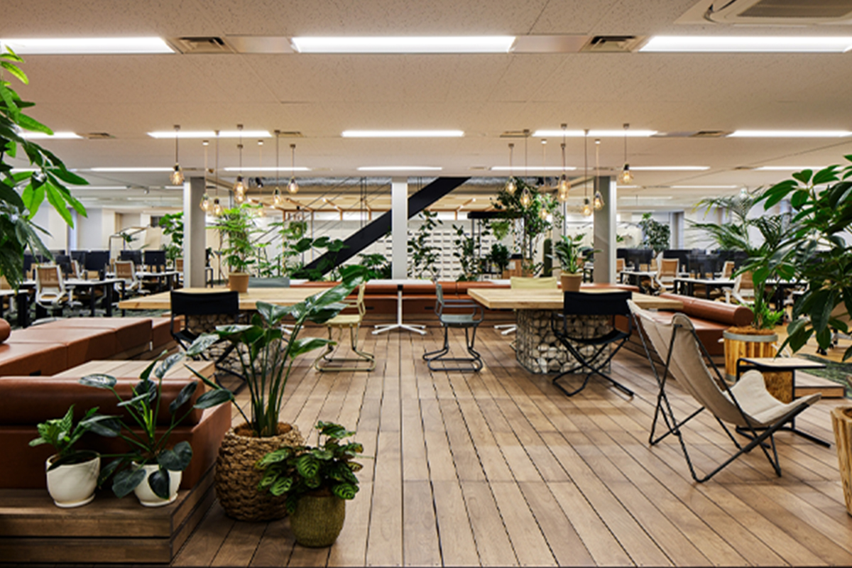 大きなテーブルをシェアして利用できます。テーブルの中心にはパーテーション代わりのグリーンを配置しています。