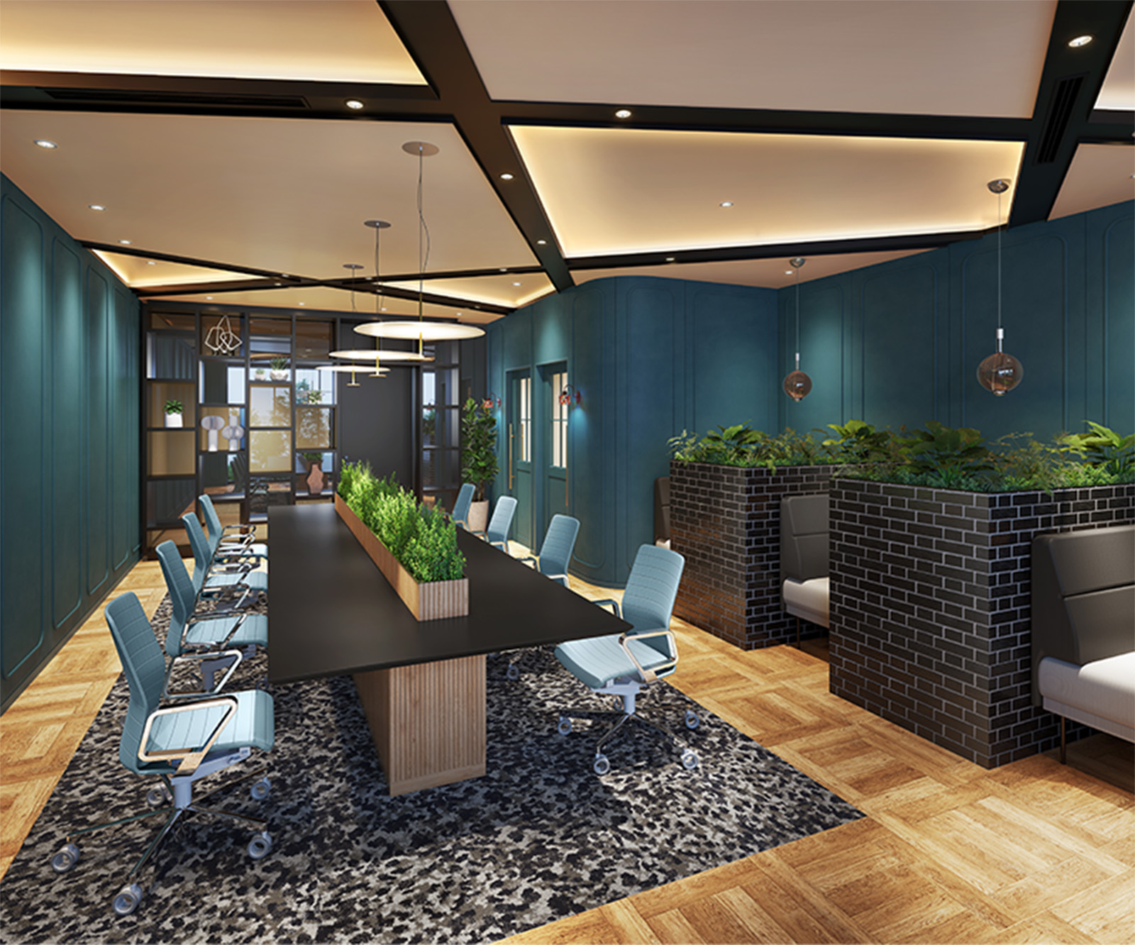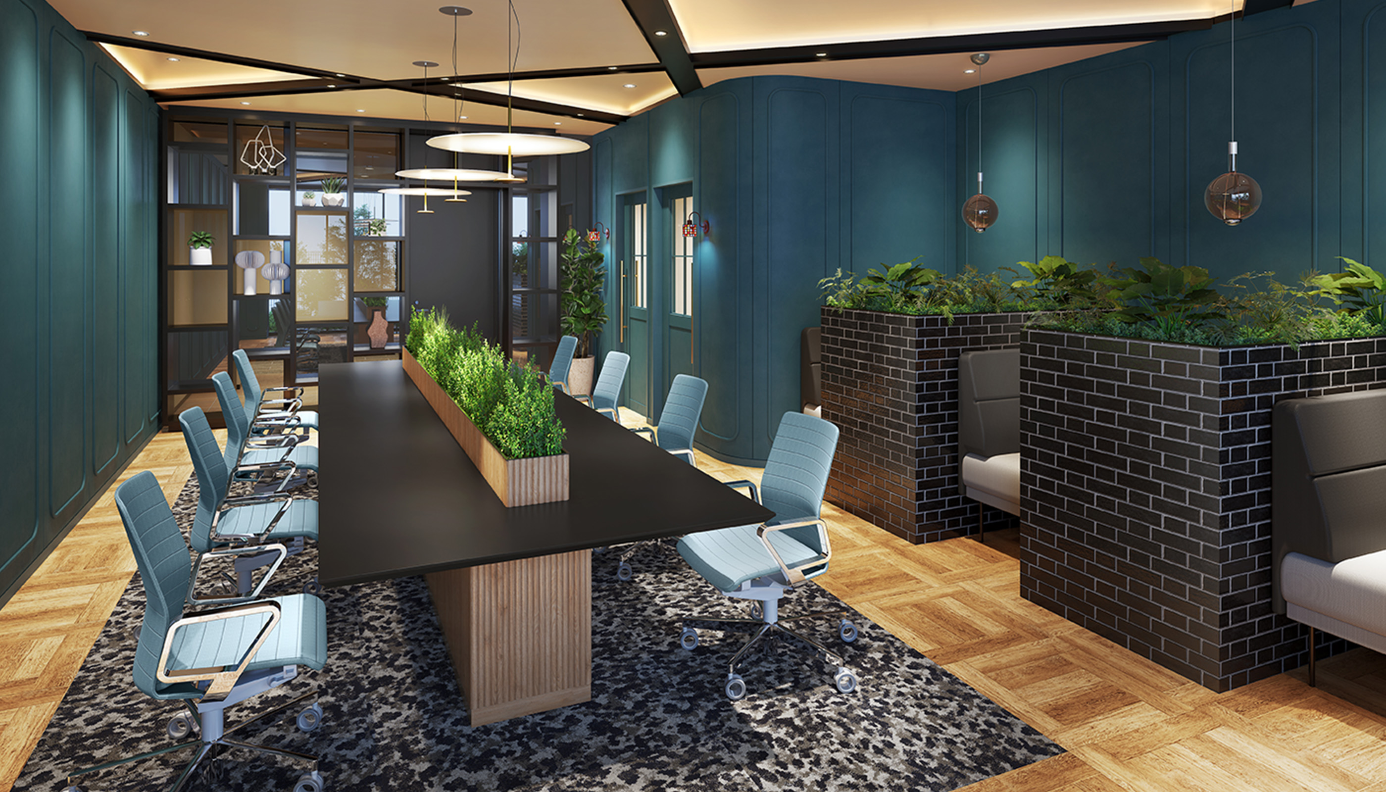 深いブルーグリーンの壁やモダンな照明は、