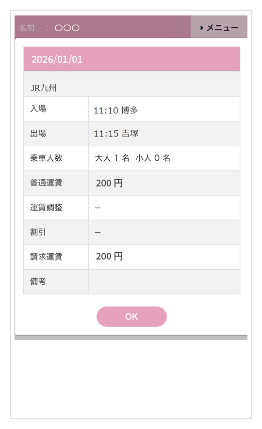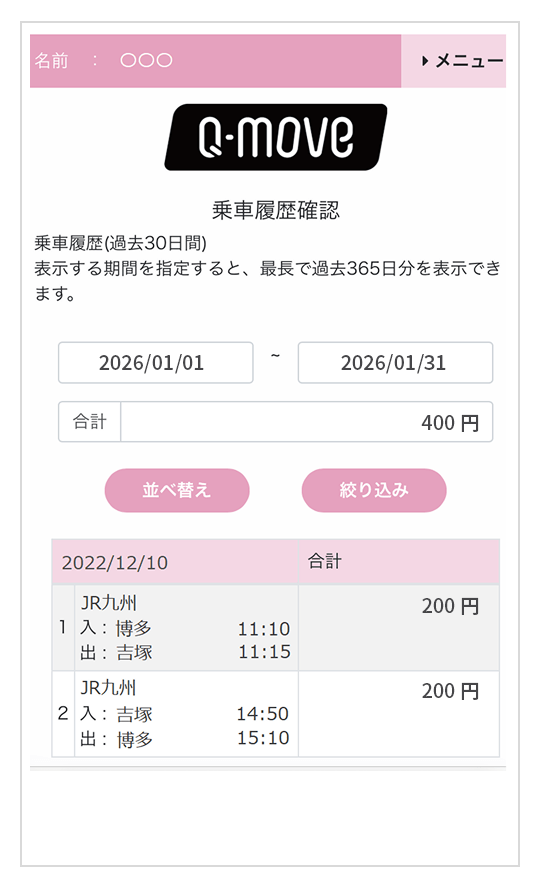 カード会社さまのご利用明細には、1日の乗車利用分が合算された金額で表示されますので、Q-moveサイトにて乗車履歴、運賃をご確認ください。