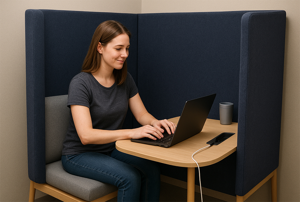 image photo 集中したいときに便利な半個室型のチェアを3つご用意しました。コンセントやドリンクホルダーを備え、集中して作業を行えます。