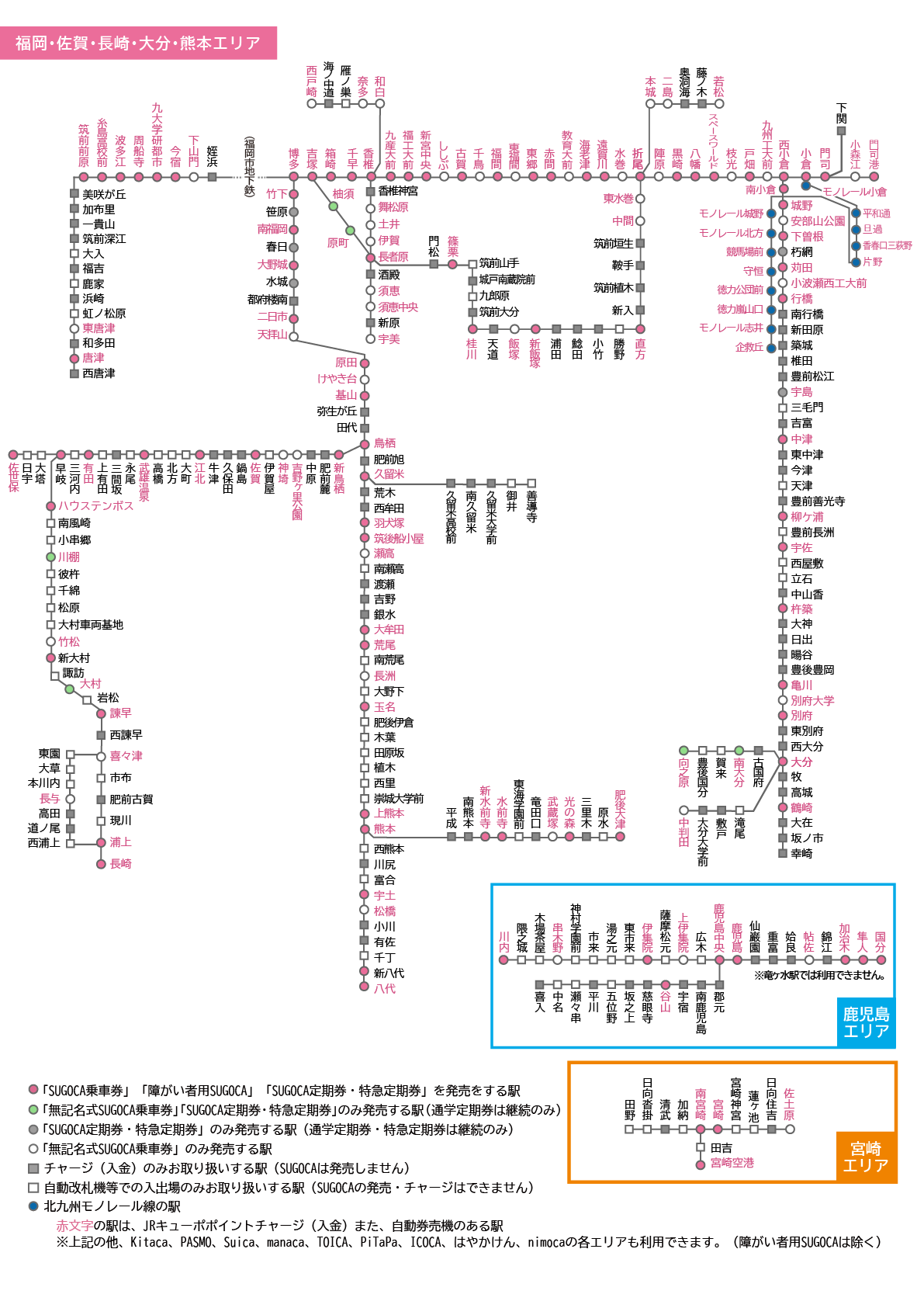 - SUGOCAのカード残額では、九州新幹線および西九州新幹線には乗車できません。定期券で新幹線を利用されるお客さまは、磁気定期券をお買い求めください。「SUGOCA乗車券」または「SUGOCA定期券・特急定期券」をお持ちで新幹線を利用される場合は、別に乗車券と特急券をお買い求めいただく必要があります。