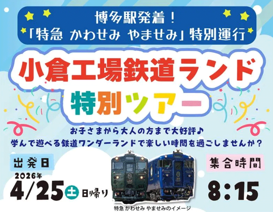 - 4月25日(土)出発>【博多駅発着】「特急 かわせみ やませみ」特別運行 小倉工場鉄道ランド特別ツアー