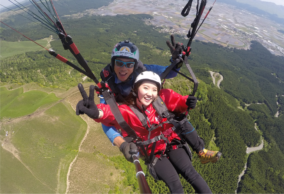 阿蘇の大自然を舞台に、さまざまなアウトドアスポーツを主催する阿蘇ネイチャーランド。アドベンチャーバギーなど新たなアクティビティもある中、パラグライダーは雄大な阿蘇を空から満喫できるとっておきの体験。高さ約30mの丘から大空へ羽ばたき、操縦棹を使って旋回。半日体験ではレクチャーの後に単独飛行。初心者でも鳥のように空中散歩でき、空から眺める雄大な大地は、忘れられない景色に。またインストラクターと阿蘇外輪山から飛び立つタンデムフライトもあり。