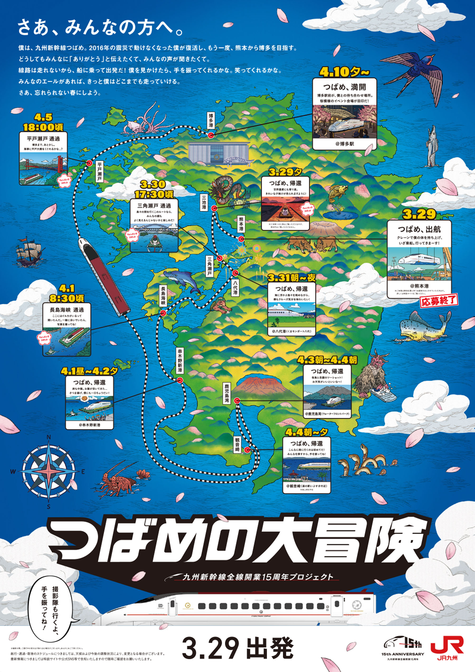 九州新幹線の全12駅に、今回“大冒険”に出る「つばめ」を応援する寄せ書き用の旗を設置します。