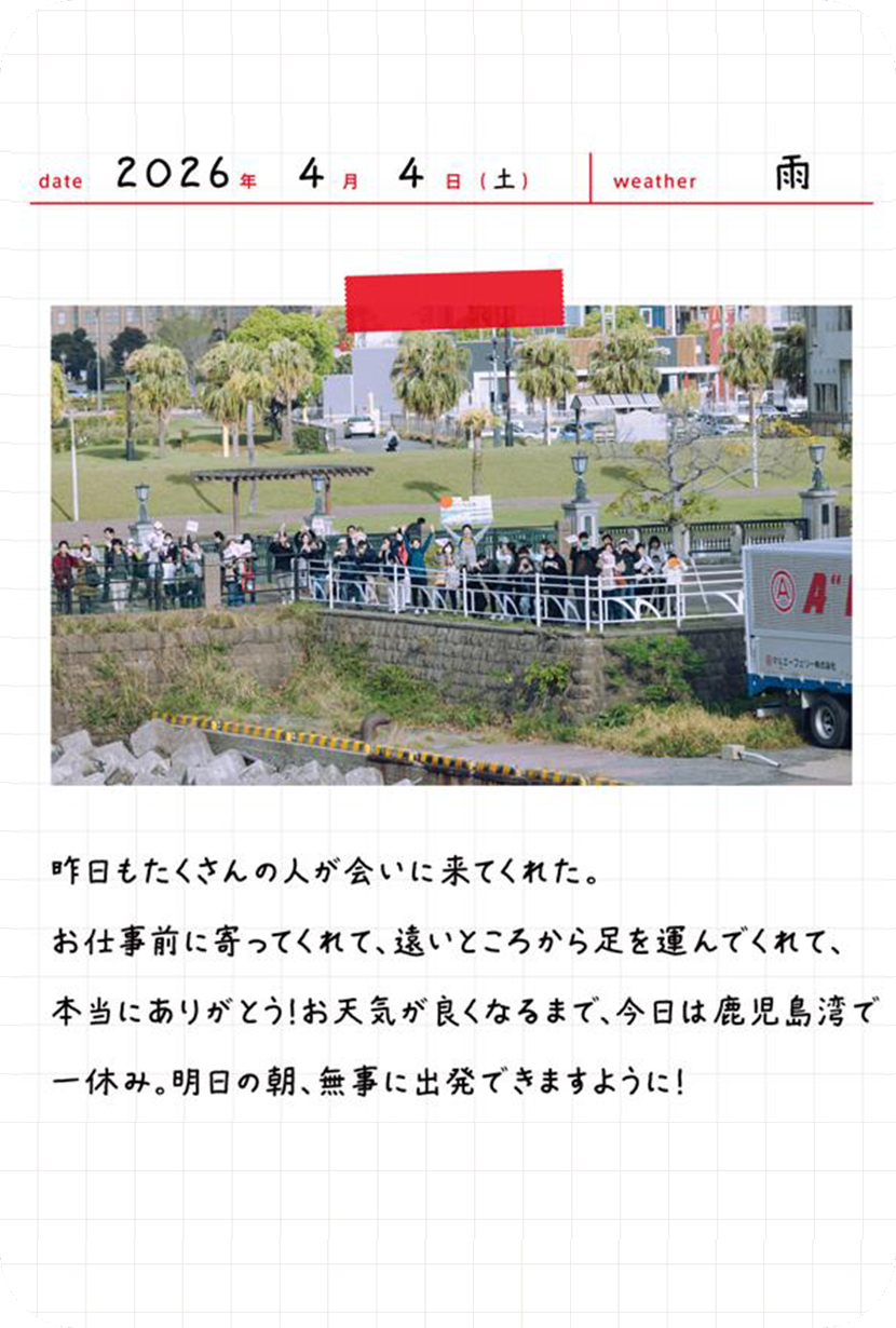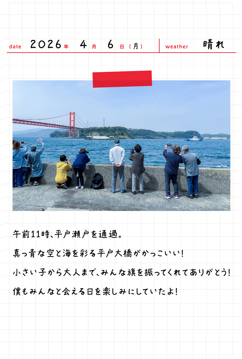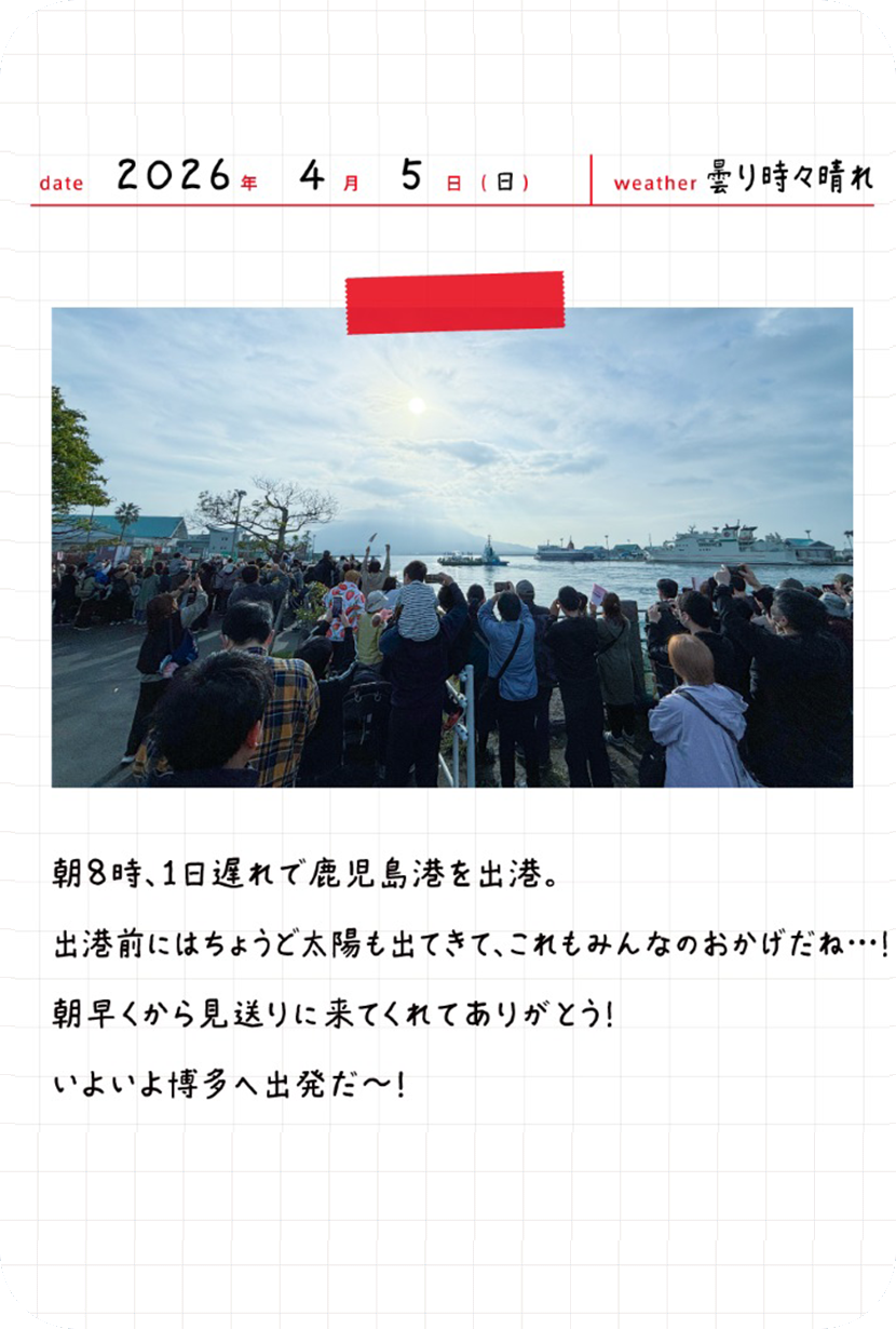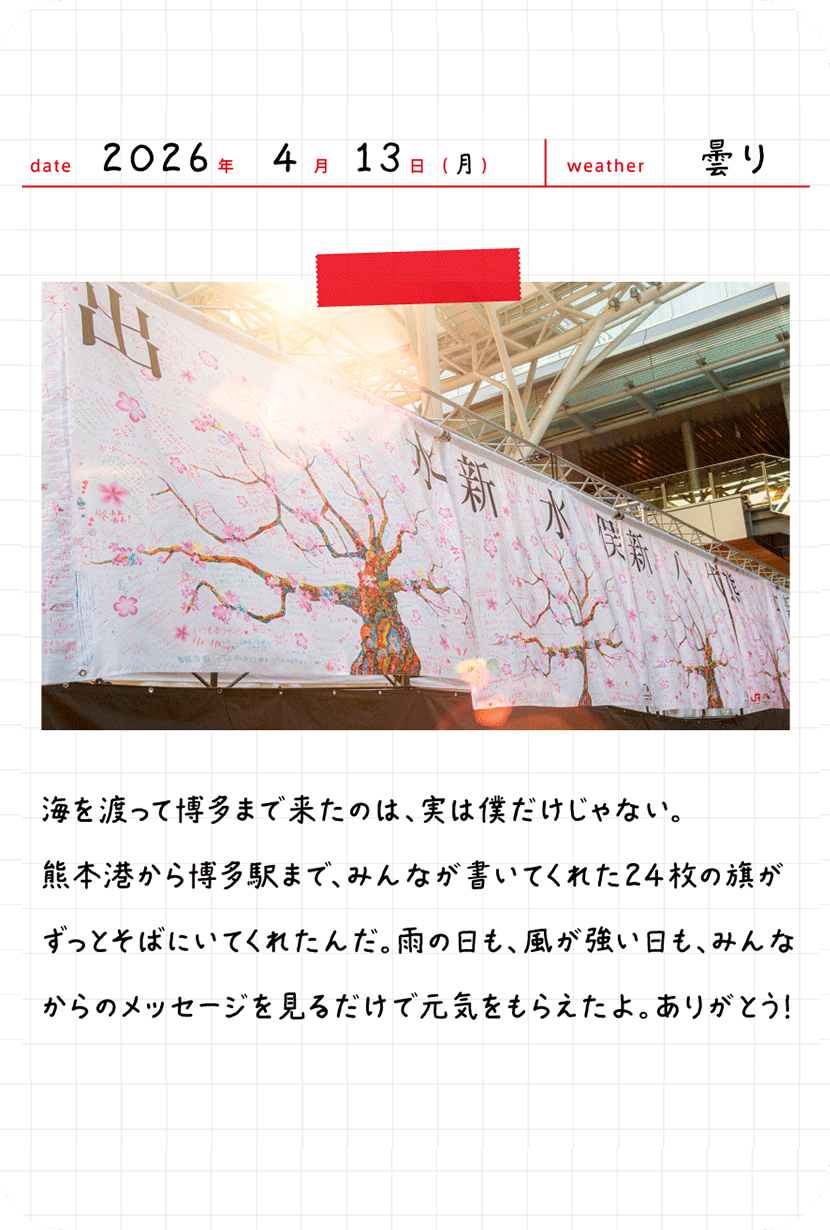 皆さまから寄せ書きいただいた旗は、3月29日の熊本港出航時に台船へ掲げます。
