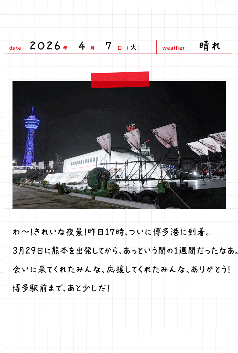 2026年3月28日(土)の深夜から3月29日(日)の早朝にかけて、熊本総合車両所から熊本港に向けて「つばめ」の陸上輸送を行います。