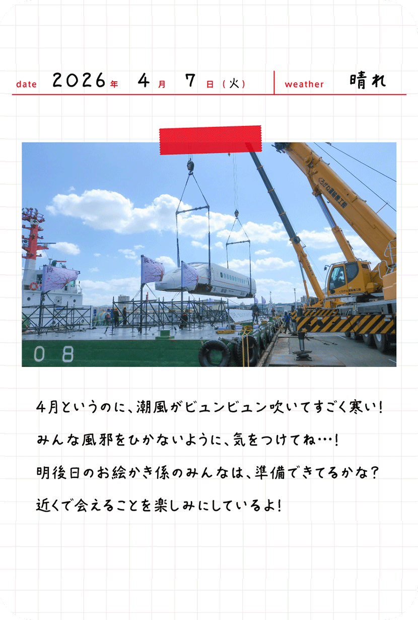 3月29日(日)の日中にクレーンで車体を吊り上げ、「つばめ」を台船に設置します。