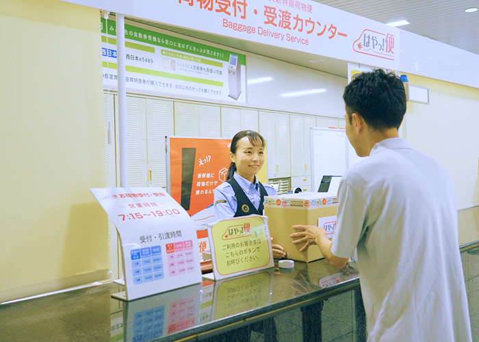 ご予約不要で、法人・個人を問わずにご利用いただける、九州新幹線での「即日荷物輸送サービス」。駅へのお持ち込み・駅でのお受け取りで、お荷物を数時間で運びます。